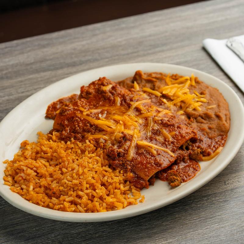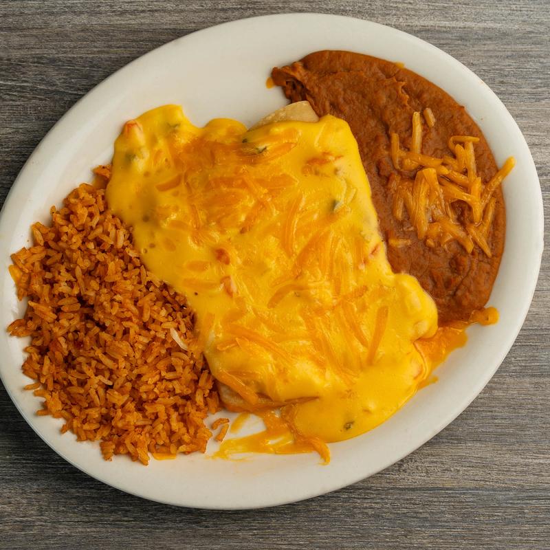 1 beef, chicken or cheese enchilada, served with rice & beans | (GF) Upon Request