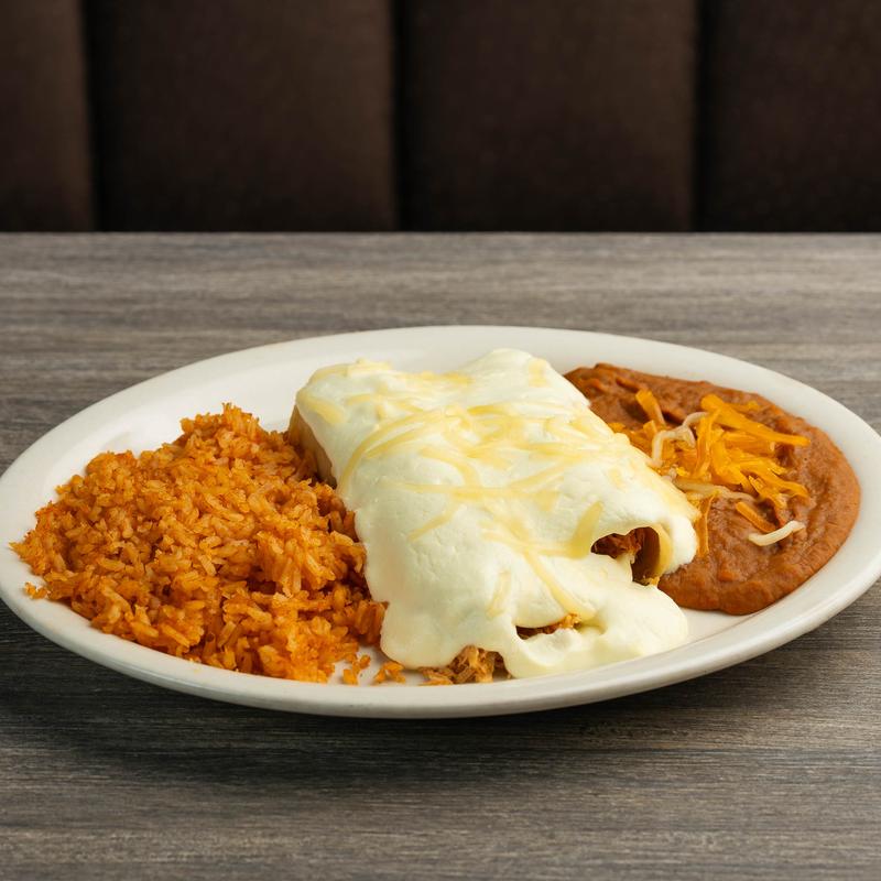 A large flour tortilla stuffed with beef & refried beans, topped with queso & cheddar cheese