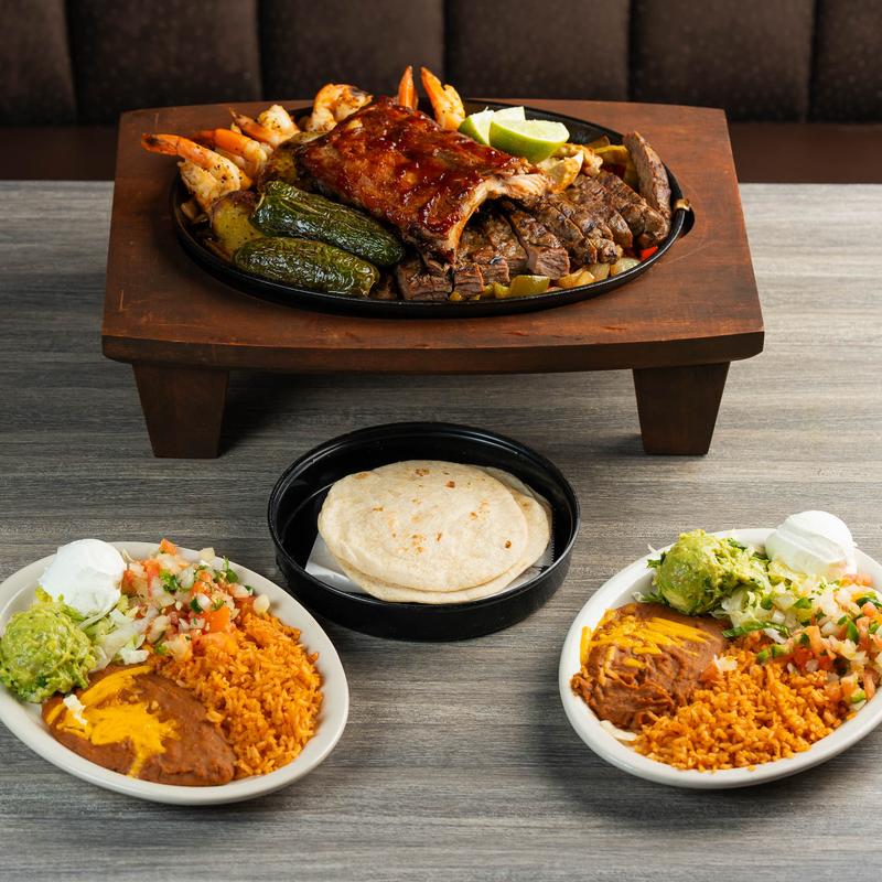 Dinner for 1 $28.00 | Dinner for 2 $54.00 • A grande skillet with beef & chicken fajitas, baby back ribs, shrimp, grilled onions & bell peppers. Served with guacamole, sour cream, pico de gallo & tortillas