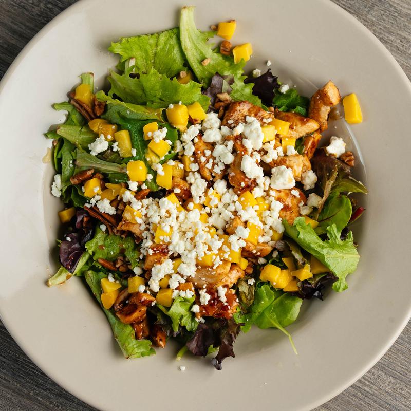 Fresh organic mix greens, diced mango, pecans, goat cheese crumbles with chicken marinated in a mango pineapple vinaigrette | (GF) Upon Request